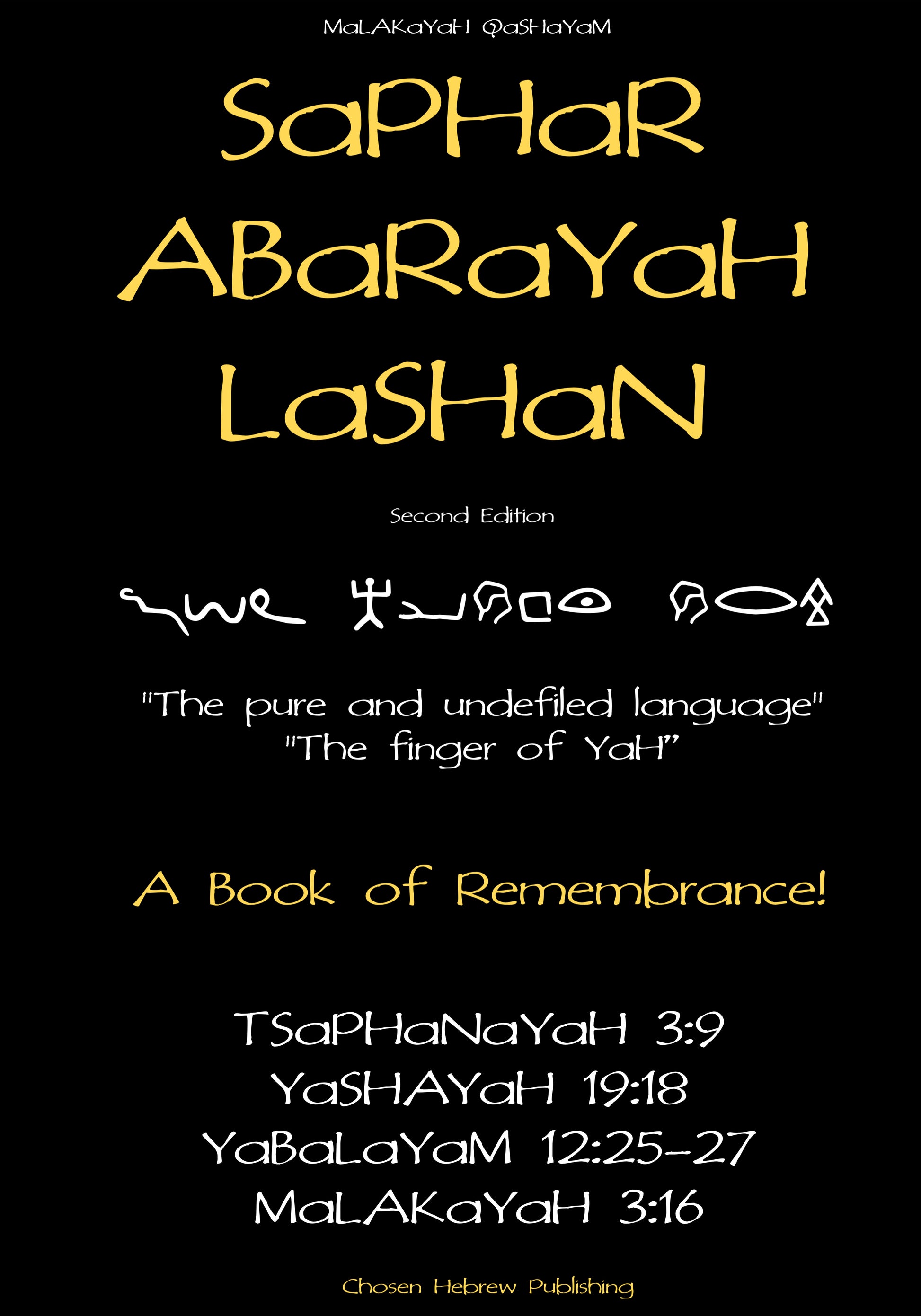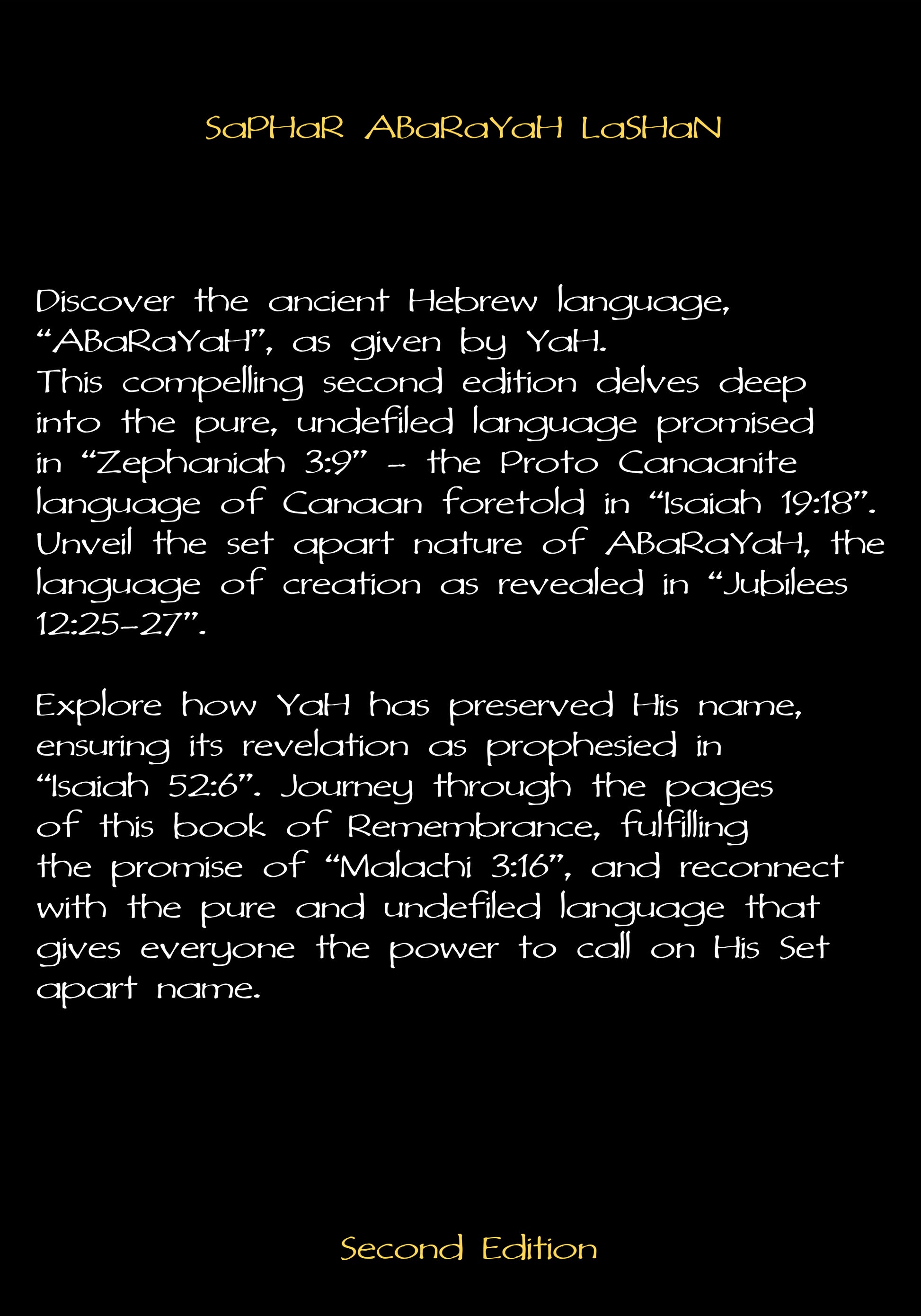 Discover the ancient Hebrew language, "ABaRaYaH", as given by YaH. This compelling second edition delves deep into the pure, undefiled language promised in "Zephaniah 3:9"- the Proto Canaanite language of Canaan foretold in "Isaiah” 19:18" Unveil the set apart nature of ABaRaYaH, the lanquage of creation as revealed in "Jubilees 12:25-27" . Explore how Yah has preserved His name, ensuring its revelation as prophesied in "Isaiah 52:6". Journey through the pages of this book of Remembrance, fulfilling the promise of "Malachi 3:16", and reconnect with the pure and undefiled language that gives everyone the power to call on His Set apart name.